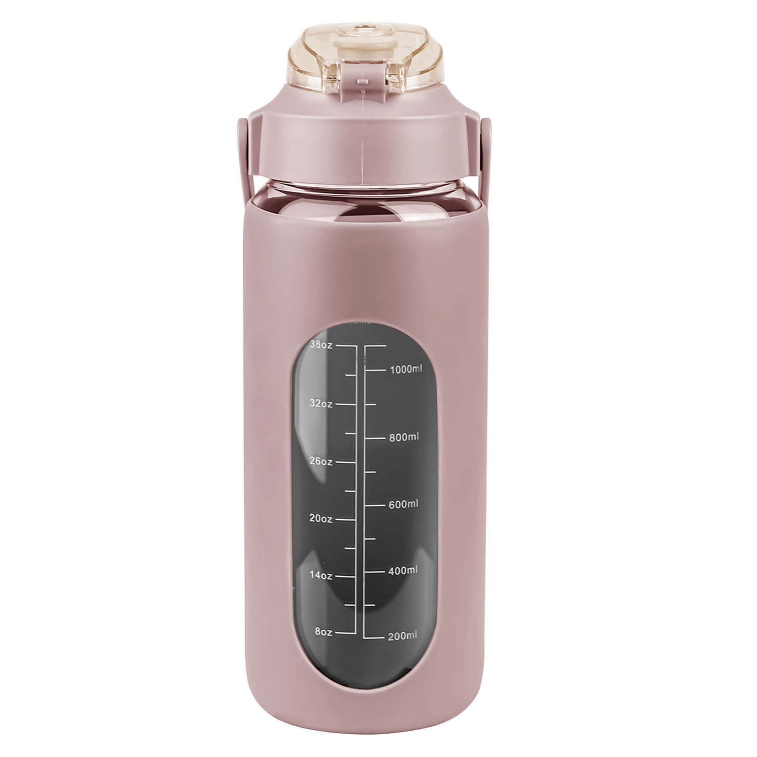 Are you tired of forgetting to stay hydrated throughout the day? Look no further than our motivational water bottle! Comes with timer markers and and precise volume on the side, helping you track your water intake with ease. With its large capacity(32Oz or 64 Oz), you can refill the sports water bottle up less frequently and keep yourself refreshed all day long. Made of high borosilicate glass, suitable for both warm and cold beverages, heat-resistant, dishwasher safe and healthy to use. Slip resistant with silicone sleeve and easy to carry with a built-in handle. And for added convenience, it features a built-in straw, making it easy to drink water on the go. Plus, its stylish design and motivational messages will inspire you to keep pushing towards your health goals. So why wait? Invest in our water intake tracker bottle today and take the first step towards a healthier, happier you!